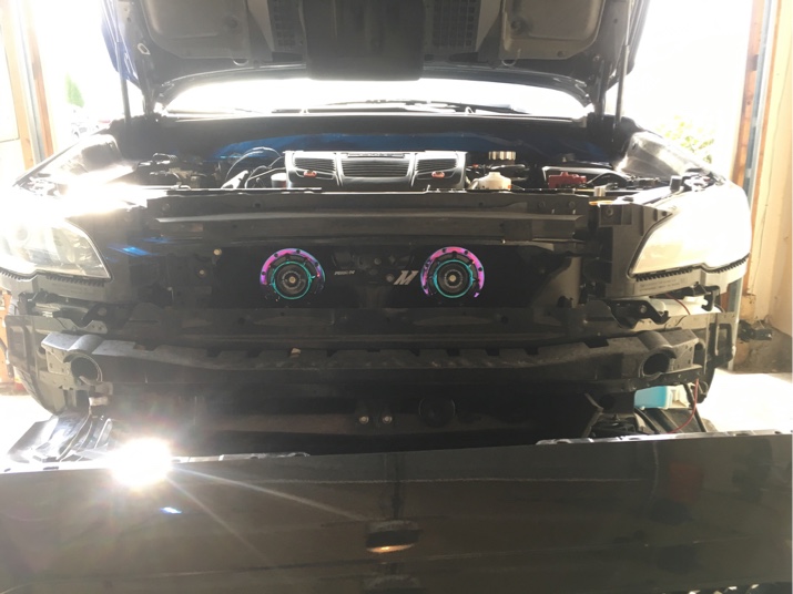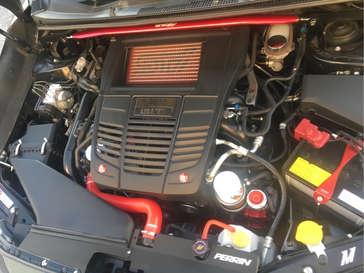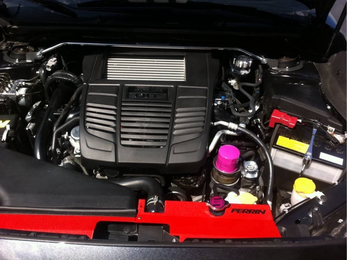 STi Performance Exhaust, STi Short Throw Shifter, Tanabe springs and front strut bar, Perrin radiator shroud, engine cover lockdown, and cam solenoid guards. Mishimoto oil cap, brake fluid cap, and battery tie down, Mishimoto radiator hose kit and lug nuts